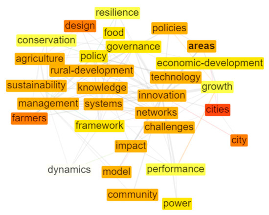 The co-occurrence map of the most frequently used terms in the abstracts of the papers (Figure 3) was created to reveal the link between them and visualize the main clusters derived from the corresponding terms. This map unearthed and visualized three main clusters, related to the resilience of rural areas, rural development through social innovation, and economic performance, and one smaller cluster which reveals a link between design, farms, and cities. A closer look at the clusters shows that resilience is associated with conservation, growth, and performance. The dominant cluster depicts the connection between rural development and sustainability with innovation terms and key components of innovation procedures and management (i.e., technology, systems, challenges, etc). The terms economic development, governance, policy, power, and food are associated. It therefore seems that there is a dominant tendency of bibliographic focus on the possibilities of innovation, the development of the rural area, and the response and the actions needed to achieve social cohesion.