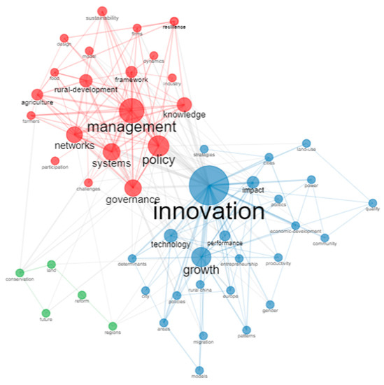 Three clearly distinct clusters emerge. The first cluster highlights the strong correlation between innovation which can lead to growth and economic development, the prospects and impact of technology, the social and demographic dimensions of the areas under study, and the policies adopted by governments. The second cluster identifies the issues that stem from the principles of management and are the basis for its successful operations or for the implementation of successful policies. More specifically, the second cluster includes the co-occurrence between knowledge and networks (especially for best-practice exchanges between regions), systems development, and the promotion of rural development and resilience. The third cluster concerns the co-occurrence of the transformation of the regions and conversations about their future evolution. Finally, the keywords innovation, growth, management, policy, and governance display the highest values of betweenness.