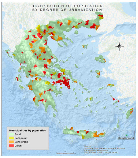 - Salvia, Rosanna, Gianluca Egidi, Luca Salvati, Jesús Rodrigo-Comino, and Giovanni Quaranta. 2020. In-Between ‘Smart’ Urban Growth and ‘Sluggish’ Rural Development? Reframing Population Dynamics in Greece, 1940–2019. Sustainability 12: 6165. [Google Scholar] [CrossRef]