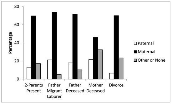 Percentage of paternal kin, maternal kin, and others who were nominated as a child’s primary material resource provider (other than household members), by family type.