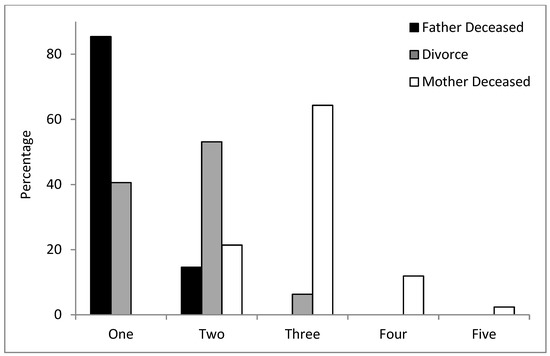 Child’s age differed significantly across the family types (F4,308 = 12.16, p < 0.0001). Of note is the fact that children of divorce were younger (mean 6.7 years) than those of widows (9.4 years) or deceased mothers (8.5 years), partly because children were younger at the time of parental divorce or estrangement (mean 2.8 years) than at the time of a parent’s death (mean age 4.2 years in both father-deceased and mother-deceased groups). A child of divorce was also much more likely to be an only child: 19 of 31 for whom the information was available (61%) had no full siblings, compared to just 5% of the children of widows and 19% of those with deceased mothers (p < 0.0001 by χ2 test).