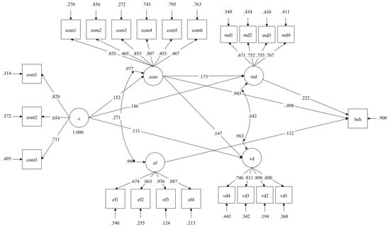 Predicted model (n = 1018). Note: C, online intergroup Contact; COM, online community commitment; EF, empathic feelings, MD, Mediated Discrimination; VD, Vicarious Discrimination; BEH, anti-racist behavior.