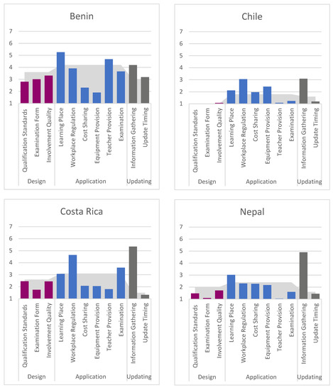 Figure 3 shows the process level, just below the more comprehensive phase level. Benin is the highest in all design-phase processes, and Chile is the lowest. The most important process in the design phase is setting qualification standards (15.8% of total weight). In this area, Chile scores a no-linkage 1.0 because curricula are completely determined by education-system actors. Although the qualification-standard-setting process is controlled by the ministry of education in Costa Rica and Nepal, both score slightly better because the leading TVET governance organizations for both have employer advisors. Benin’s qualification standards are set more collaboratively because the CQP is a formalization of existing traditional apprenticeships.