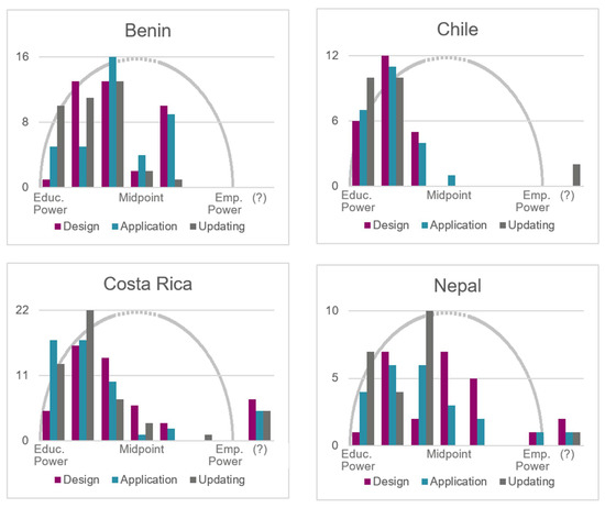 Chile and Costa Rica show the same pattern for their school-based TVET programs, such that most—but not quite all—of the decision-making power over these two programs lies with education-system actors in the view of the experts. These are both established school-based programs, which accounts for both the education-heavy power balance and general agreement among respondents. Benin and Nepal show wider distributions of power-balance assessments, with Benin’s mostly concentrated just to the education side of the midpoint and Nepal’s more diffused.