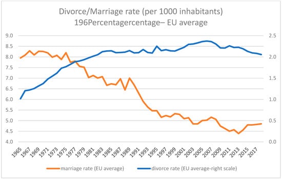 Since 1960, the crude marriage rate (that is, the ratio of the number of marriages during the year to the average population in that year; the value is expressed per 1000 persons) in Europe has fallen, on average, by around 40% (from 8 per 1000 persons in 1960 to 4.9 in 2018). In addition, with the consolidation of the legal institution of divorce, the crude divorce rate (that is, the ratio of the number of divorces during the year to the average population in that year; the value is expressed per 1000 persons) has doubled, increasing from 1 per 1000 persons in 1960 to 2 in 2018, with a peak of 2.3 in 2006–2007 (Figure 1). The time series 1965–2018 only refers to countries with a divorce law in their legal system from 1965. As a consequence, Italy, Ireland and Spain are not included. Note that in the figures involving time series, only the countries with complete time series are considered. Therefore, the average values refer to the countries in the sample.