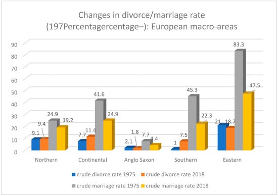 The divorce trend is less uniform, probably due to the different timing of the introduction of the divorce law in the national legal systems. The largest increase characterizes the Southern countries where—in the period 1975–2018—the divorce rate has increased by more than 600%. This evidence is probably due to the recent introduction of the divorce law in some countries. In Italy, divorce was legally recognized in 1970, while it was introduced in Spain in 1932, then abolished and finally reintroduced in 1981. Over the last 40 years (from 1981 to 2018), the legalization of divorce has led to an increase in the divorce rate of more 500% in Spain and Italy.