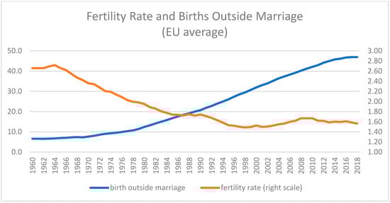 Changing perspective, we can also point out that the household’s structure affects the income levels of its components. Households that include couples are less likely to be poor because the second adult—on average—adds more to potential income than to consumption, given the economies of scale stemming from cohabitation (; ). Therefore, on the one hand, the reduction in the family size due to the decline in marriages as well as to the increase of divorces may increase the vulnerability of individuals regarding poverty. On the other hand, the reduction of families’ size is also due to a reduction of fertility. In this case, the decreasing number of children can, ceteris paribus, reduce poverty. However, empirical analyses show that, while the total fertility rate decline tends to reduce poverty (all else equal), the growth of children born outside marriage can have the opposite effect (; ).