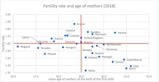 The decreasing trend of the fertility rate has been accompanied by an increasing trend of the number of births outside marriage, which accounted for less than 10% (6.6%) of births in 1960 and nearly 50% (46.9%) in 2018. In addition, births data show that in most European countries, the number of first births increased from 1980 to 2018, while the number of births after the first one decreased, with particular reference to the third or higher birth order (Table 1). Exceptions are represented by the Nordic countries and the Eastern European countries, albeit for different reasons. Northern Europe is characterized by a generous welfare system supporting families with children through an extensive service supply, better allowing the reconciliation of work–family. Eastern Europe is characterized by younger mothers on average at first birth, and this may explain the higher or close to average fertility rate (1.6) in that cluster of countries (Figure 4). Only France and Iceland are similar to the Eastern countries, with a mean age of mothers at first birth smaller than average (29 years) and a fertility rate higher than average. Mediterranean countries are all characterized by a low fertility and a high mother’s age at first birth.