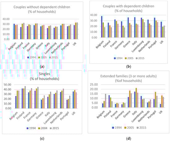 The framework outlined for 2019 is, however, the result of changes over time (Figure 5a–d). Analyzing the last 20 years and a group of countries for which we have complete data, we note a generalized decrease in the traditional family, composed by a couple with children, and a generalized increase of single families (including single without children and single parents).