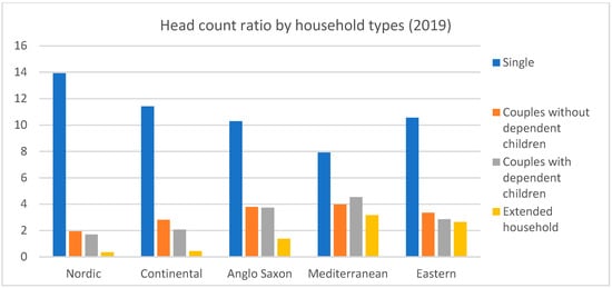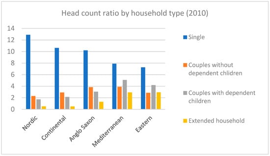 Poverty is basically concentrated in the smallest household type, the single-person household, and, to a lesser extent, in the single-parent household. More traditional households, as couples with and without children, are less vulnerable to the risk of poverty. The disaggregated analysis for household type confirms this phenomenon for all European macroarea even when considering a time interval of about 10 years (Figure 6 and Figure 7).