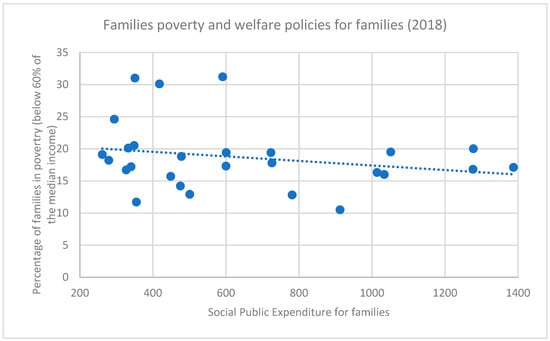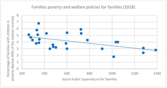 Basically there are three types of public support for families: child-related cash benefits, including child allowances, public payments during the periods of parental leave, and income support for sole parents families; in kind benefits regarding childcare and childhood assistance and education; fiscal support through tax exemptions (such as child cash benefits not included in the tax base), child tax allowances (in the form of deductions of the tax base) and child tax credit (in the form of tax cuts) (). Figure 8 and Figure 9 show the relationship between total social public expenditure for families (cash and in-kind benefits) and the percentage of families in poverty, considering both the group of all families and the group of families with children. The relationships point out a stronger correlation between public policies for families and reduction of poverty for families with children.