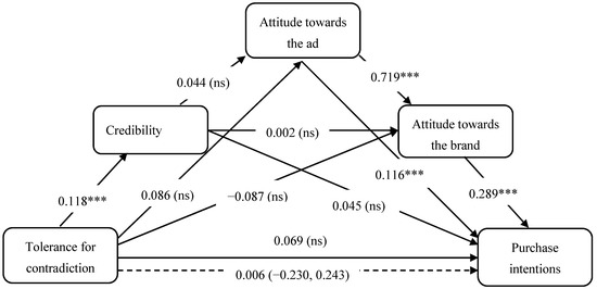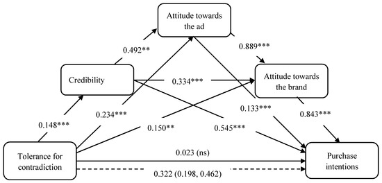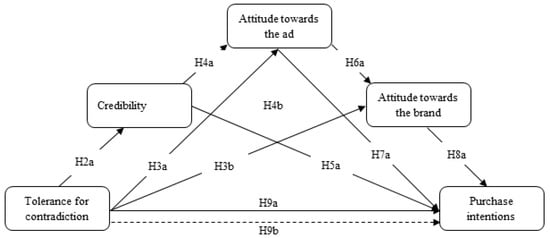 The relationship between the tolerance for contradiction and purchase intentions is fully mediated by credibility, attitude towards the advertising, and attitude towards the brand.