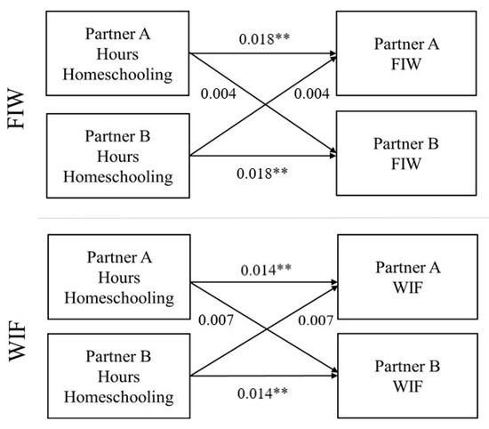 Consistent with H4, one’s own time spent homeschooling was significantly related to one’s own WFC in the homeschooling couples—both for FIW (p = 0.001) and WIF (p = 0.017) (Figure 1).