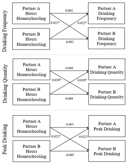Actor–Partner Interdependence Model (APIM; Indistinguishable Dyads) examining actor and partner effects of time spent homeschooling on drinking frequency, quantity, and COVID-19 peak drinking. * p < 0.05; ** p < 0.01; *** p < 0.001.