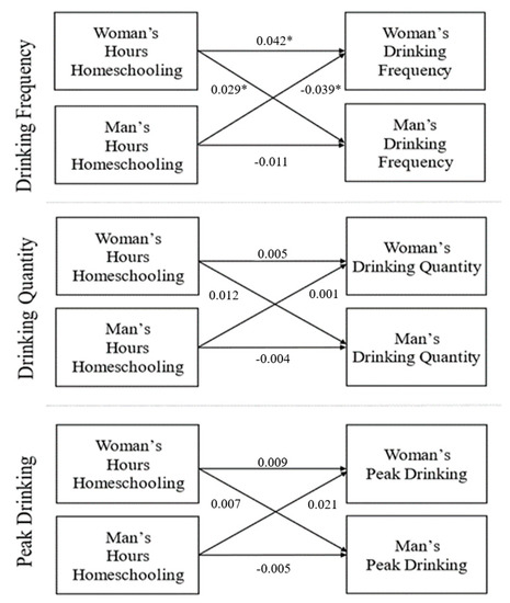 Consistent with H5 and H6, respectively, the woman’s time spent homeschooling was significantly and positively related to both her own (p = 0.011) and her partner’s (p = 0.022) drinking frequency, consistent with both the multiple-burdens hypothesis and adverse cross-over effects, respectively (Figure 3). In contrast, the man’s time spent homeschooling was unrelated to his own drinking frequency. Additionally, the man’s time spent homeschooling was significantly negatively related to his partner’s drinking frequency (p = 0.015), suggesting protective cross-over effects of the man’s time spent homeschooling on the woman’s drinking (Figure 3).