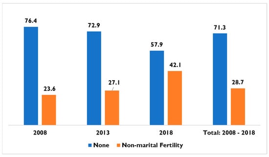 Furthermore, household wealth index has been identified as one of the key correlates of non-marital fertility; studies have submitted that richer individuals are statistically less likely to have non-marital fertility compared to poor unmarried women, and the explanation for this is that that poorer women are bedeviled by unmet need for contraceptives that can help them avoid unintended pregnancies, whereas richer women are not to be faced with such issues and can easily avoid non-marital births, except if they decide to go for it by choice (; ). Studies have also established the predictive power of employment status on non-marital fertility; it has been stated that employed unmarried women are more likely to experience these unconventional types of childbirth—non-marital fertility (; ; ; ). Two notable studies of non-marital fertility in sub-Saharan Africa have both reported a significant relationship between marital status and non-martial fertility, and non-martial births are higher and more likely to happen amongst cohabiting women compared to single or never-married women. This comes with evidence to support that cohabitation or living with a partner is playing an increasing role in the family system across the world, and even in several sub-Saharan African countries. In this kind of arrangement, which is not regular marriage, people have started bearing children as much as married couples, without the due marital rites (; ; ). Lastly, a few other factors have been identified as correlates of non-marital fertility; ethnicity is one of such, and it has been reported to significantly predict non-marital fertility and its differentials. One of the recent evidence on non-marital fertility in Ghana reported ethnicity as one of the correlates of non-marital fertility, and this is in tandem with what has been found in the United States, where women of a certain racial/ethnic group have increased non-marital fertility relative to women from other groups, as well as another study in South Africa that reported differing risks of non-marital fertility among various population groups (; ; ).