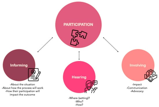 A broader vision of the participatory approach in the field of protection considers participation as a central strategy in efforts to improve the ecosystem of services to prevent situations of child abuse, as well as to intervene when their safety and development are compromised. This ecosystem is the institutional space that shapes family relationships and the conditions that enable active participation: (1) in understanding the realities that affect them, (2) in the decisions that are made, (3) in the actions that are carried out and (4) in the evaluation of the situation resulting from those decisions and actions (). CA are thus seen as beings with the capacity for understanding, interpretation, negotiation, conciliation and expression (; ; ) and, consequently, they become key actors in their lives (). According to (), it is essential to improve the effectiveness of protection services by giving children a voice but also by expanding their citizenship rights and ensuring their participation in all stages of the processes intended to protect them, including socio-educational actions (). This requires personalised case-by-case attention based on a child rights approach, which not only involves the child but also respects the general principles of the CRC, the evolving capacities of the child and the specific context ().