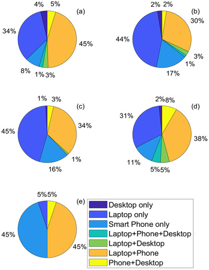 In the IT School, male students said they used a laptop–smartphone combination (42%), laptop only (39%) and smartphone (18%), as shown in Figure 4d. Further, Figure 5d indicated that the device use is between laptops (58%) and smartphones (42%). Among the female students, the clear choice was the laptop only (58%), followed by a laptop–smartphone combination (33%) and smartphone only (8%), as shown in Figure 4d. Further, it was also observed that only two devices were used: laptop computer (71%) overwhelmingly popular, followed by the smartphone (29%), as shown in Figure 5d.