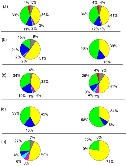 Device combinations used by male (left column) and female (right column) students in the schools: (a) Engineering, (b) Technology, (c) Business, (d) IT and (e) Music. Legend: green is laptop only, blue is smart phone only, red is desktop only, yellow is laptop+phone combination, cyan is laptop+phone+desktop combination, magenta is laptop+desktop combination, grey is phone+desktop. Note, percentage shown in each figure is rounded to nearest whole number and hence the total may or maynot be equal to 100%.