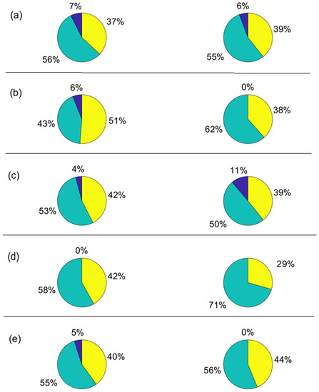 In the Music School, male students reported to be using mainly the combinations of laptop–smartphone (47%) and laptop only (27%), as shown in Figure 4e. At the same time, Figure 5e showed that the device use is spread over three devices laptops (55%), smartphones (40%) and desktop computers (5%). Among female students, it was reported a very high reliance on laptop and smartphone combinations (78%), followed by laptop only (22%), as shown in Figure 4e. Additionally, the devices used by female students were found to be laptop computer (56%) and smartphone (44%), as shown in Figure 5e, without any use of the desktop computer.