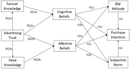 A conceptual model is proposed below to integrate the hypotheses and research questions stated above (see Figure 1). The model illustrates that trust in BW advertising is related to BW knowledge (factual vs. false) and the latter is associated with cognitive and affective beliefs. It also demonstrates how cognitive and affective beliefs are connected to attitude and perceived subjective norms toward BW consumption and purchase intention.