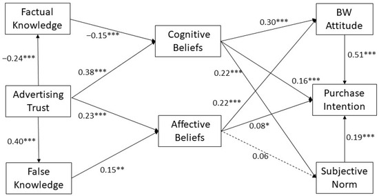 RQ1a–b query whether trust in BW advertising is associated with factual and false BW knowledge. Results showed that trust in advertising was a negative predictor of factual knowledge (B = −0.24, p < 0.001) and a positive predictor of false knowledge (B = 0.40, p < 0.001), as anticipated. Per the query of RQ2a-b, the study tested whether trust in BW advertising is positively related to cognitive belief and affective belief about BW consumption. As expected, trust in advertising was found to be a positive predictor of both cognitive beliefs (B = 0.38, p < 0.001) and affective beliefs (B = 0.23, p < 0.001). RQ3a asks whether false knowledge is positively related to affective beliefs about BW consumption. Findings indicated that false knowledge was a positive predictor of affective belief (B = 0.15, p = 0.002). By contrast, RQ3b aims to attest the potential negative relationship between factual knowledge and cognitive beliefs about BW consumption. Factual knowledge emerged as a significant and negative predictor of cognitive beliefs (B = −0.15, p < 0.001).