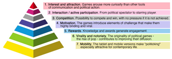 According to Antoni Gutiérrez-Rubí (2014), rulers and their teams have realized that casual games constitute a new space for action and communication due to their appeal, potential intergenerational use and acceptance among youth. Regardless of this observation, any study on politicking can help verify that the creators of a successful app do not need to maintain direct ties to political parties or governments. Ideological interests are put aside, and the focus is on entertainment through the application of seven keys (Figure 1).