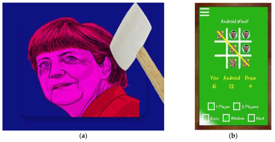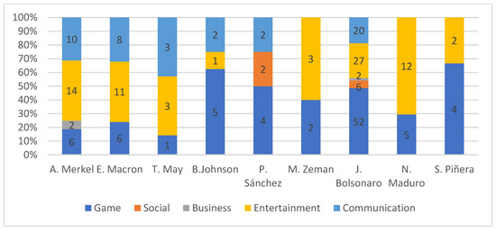 The political profiles of Angela Merkel and Emmanuel Macron respond from a quantitative perspective to a much more corporate and less controversial reality than those of their counterparts in other countries. To be precise, a certain balance is identified between the different types of apps and a proportion of games that ranges between 18 and 24%. This data—the percentage of games—are related to the fact that game-based content usually has high satirical content. However, the entertainment section implies a desire to integrate these political figures into discourses, since they consist mainly of stickers and soundboards that allow their interaction with messaging tools such as WhatsApp, Telegram or Facebook (among other social networks). In contrast, Boris Johnson and Jair Bolsonaro have a significant presence of content framed in the “games” category.