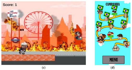 The type of content offered by these games often also depends on the nature of the type of political profile. In these cases, for example, the games associated with leaders of the institutional profile correspond to a simple design that uses popular game mechanics such as Flappy Birds, Whac-A-Mole or Tic-Tac-Toe, with slight aesthetic variations that hardly develop a government-like discourse (Scheme 1a,b). Conversely, games involving Jair Bolsonaro, Nicolas Maduro or Boris Johnson are more critically loaded in terms of the controversies with which they are associated. Recurring, therefore, are the bellicose connotations of the presidential election as used by Bolsonaro in 2019 (Scheme 1d), the debate around Brexit (Scheme 1c) or the international controversies of Nicolas Maduro.