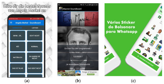 Most downloaded apps of the sample. Source: the respective applications. (a) Angela Merkel Soundboard (Pentagames 2017). (b) Macron Soundboard (Wonderapply 2017). (c) Stickers do Bolsonaro (appssyncs 2018).