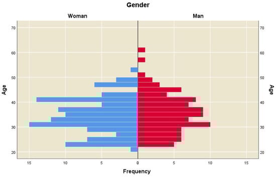 The study sample consisted of 201 participants (110 females and 91 males), who previously graduated with an official university degree with no direct relation to education and are pursuing an official master’s degree in secondary education that entitles them to work as teachers. They have an average age of 34.47 years (33.94 for women and 35.12 for men) and a standard deviation of 6.67 (6.82 for women and 6.49 for men). See in Figure 1 the distribution of the sample according to sex and age.