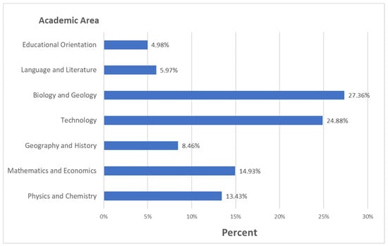 Participants are representatives of the seven different areas of expertise included in the official university master’s degree in High School Teacher Training (language and literature; mathematics and economics; biology and geology; physics and chemistry; technology; geography and history; and educational orientation), with the biology and geology modality being the most frequent (n = 55) and the educational orientation modality the least frequent (n = 10), as can be seen in Figure 2.