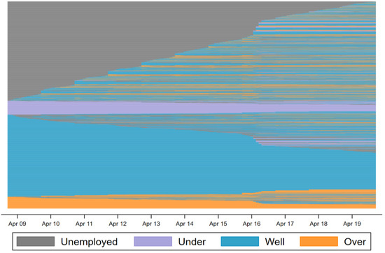 Figure 1 illustrates the monthly educational mismatch trajectory of individuals over the 2009–2019 period. Each horizontal line represents the educational mismatch trajectory of one individual. We observe several features. First, the incidence of joblessness decreased over time, following the sample inclusion criteria (individuals employed at least one month of the period examined). Second, once in a position, the individuals tend to remain in such positions over time (19% stays persistently as a good match, 3% as undereducated, and 2% as overeducated). Third, only a marginal proportion of mismatched workers (mainly overeducated) were able to transit out of such positions during the 11 years under study. Table A1 in the Appendix A sums up these trajectories in the 15 most frequent patterns. The four most frequently observed patterns (comprised around 45% of the sample) consist of one period of good match or a combination of good match and joblessness periods, either at the beginning or in the middle of the sequence.
