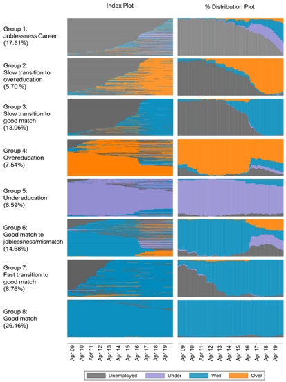 Lastly, the optimal 8-cluster solution decomposes two groups of the 6-cluster solution. The first is the “joblessness” group splitting into 2 subgroups: those whose trajectory is mostly joblessness and those whose trajectories are dominated by a long period of joblessness initially but then transit to the overeducation state. The second group is the “good match with mismatch periods” splitting into 2 subgroups: one characterized by a good match state initially, followed by joblessness or a mismatch (under or overeducation); the other starts with unemployment for a few months, followed by a good match period until the end. We label this last subgroup as “fast transition to good match.” To strengthen the understanding of this optimal solution, Figure 2 provides a graphical representation of each cluster’s monthly educational mismatch trajectories in terms of index and distribution. In addition, Table 1 fully describes these 8 clusters by their trajectory and demographic features, job market indicators, and the average entropy2.