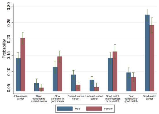 Gender plays an important role in determining membership to different educational mismatch trajectories. Figure 3 shows the predicted probabilities of following each trajectory by sex. According to this, women are significantly more likely than men to follow a trajectory that has long periods of unemployment, such as the joblessness career and the slow transition to good match career. These are also the most precarious trajectories. Men, on the other hand, are significantly more likely than women to follow more steady trajectories, such as the overeducation, undereducation, and good match career.