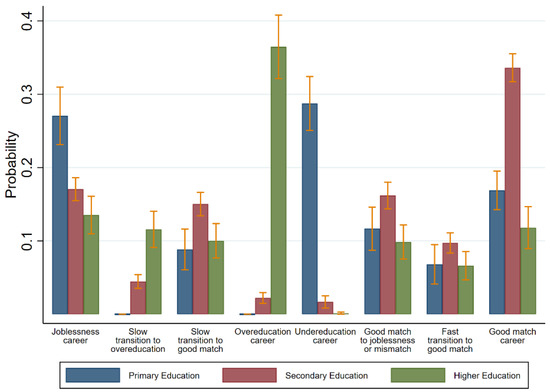 The predicted probabilities of following each trajectory by educational level are presented in Figure 4. As may be expected, having only primary education significantly increases the likelihood of following the joblessness trajectory. This result aligns with the human capital theory which asserts that education provides skills that are valued in the job market. Consequently, individuals with lower levels of education tend to face higher rates of unemployment. In the same vein, individuals with only primary education are more likely to follow the undereducation trajectory than more educated individuals. Having secondary education significantly increases the likelihood of following a trajectory involving several periods of good match, namely, the slow transition to good match, fast transition to good match, good match to joblessness/mismatch, and good match trajectory. Lastly, individuals with higher education are more likely to follow trajectories involving several periods of overeducation, that is, the slow transition to overeducation and the overeducation trajectory. Overall, these results, together with the persistence of the undereducation and overeducation states (see Figure 3), suggest that the labor market is not responding as fast as the economic theory may have predicted to accommodate workers with lower or higher levels of education.