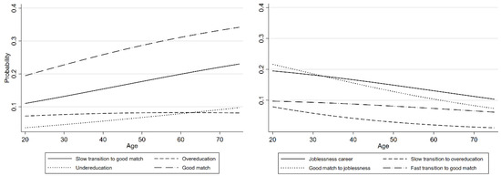 Figure 5 illustrates the predicted probabilities of following each trajectory by age. The left panel shows that the likelihood of following the slow transition to a good match and the good match trajectory significantly increases with age. This result suggests that, independent of educational level, older individuals are more likely to be part of these two groups than younger individuals, and therefore, to achieve a state of a good match. The left panel also shows that the likelihood of following the undereducation trajectory positively correlates with age (although in a lower magnitude). This means that each year of age progressively increases the likelihood of having an undereducation trajectory. Additionally, it can be observed that age does not significantly predict overeducation trajectory after controlling for sex, education, and occupation. This result could be providing us clues about the persistence of the overeducation phenomenon: it does not seem to be exclusively related to younger people in the labor market. In other words, people who enter the labor market as overeducated tend to stay in that state for long periods of time. The right panel shows that the likelihood of following the joblessness, the good match to joblessness, and the slow transition to overeducation trajectory significantly decrease with age. In other words, the probability of following trajectories that involve many periods of unemployment tends to decrease with age. On the other hand, age is not a significant predictor of the fast transition to a good match trajectory, suggesting that a rapid adaptation to the labor market has more to do with other factors aside from age, such as education level and occupation type.