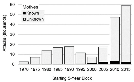 Attacks aggregated by 5-year blocks and motive information from 1970 to 2019.