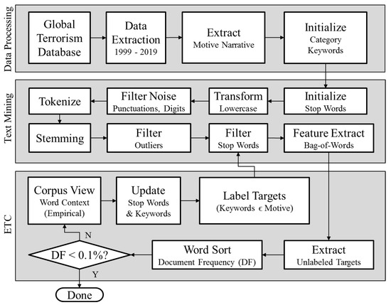 Given the above deficiencies, the author invented an empirical topic classification (ETC) technique that combined NLP methods with human cognition to identify word features that resulted in a more meaningful identification of PACs. Figure 2 shows the workflow, including custom and existing NLP procedures. The data processing layer extracted motive narratives from the selected year range of records. The author then initialized a list of potential PACs based on expertise, data sources listed in the GTD, keywords gleaned from the literature, as well as the keywords selected from the motive narrative.