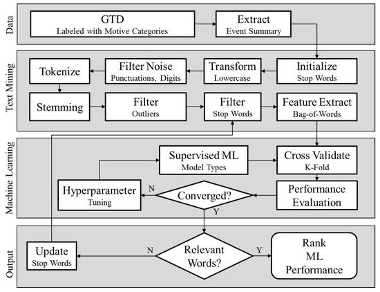 The ETC workflow discussed above helped the author to assign class labels to each record based only on the motive narrative. The ML process reused the text mining procedures to extract word features from the event summary narrative, which is a different field in the dataset. Unlike the motive field, the event summary narrative described the actions taken and the outcomes of attacks. The ML methods used features extracted from the event summary narrative to predict the PACs, which were the labels derived from the motive narrative. Therefore, good predictive performance would validate the association of the assigned PACs with the event narrative.