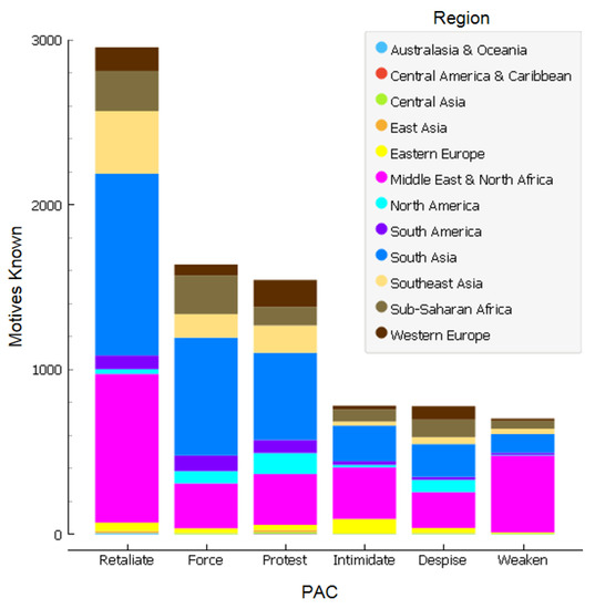 One interpretation of Figure 4 was that among known motives, aims to “retaliate” were nearly four-times more revealed by terrorist responsibility claims than aims to “weaken” the target. This suggests that terrorists were more likely to claim credit for retaliations than to advertise aims to weaken or distract their enemies. Another interesting observation is that PACs were more generally known for attacks in the Middle East, North Africa, and South Asia than for other regions of the world.