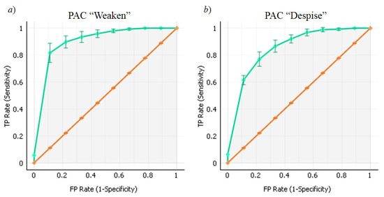 The XGB algorithm provided the best performance across all metrics. Table 5 summarizes the performance metrics of the XGB algorithm for each PAC in the OvR classification. Figure 5 provides a visual validation of the differences in AUC among the classifications. The gray background highlights the area that is equivalent to the AUC. The figure shows the ROC mean (green curve) and variations (error bars) for the 10 cross-validation results of the XGB algorithm when predicting the PAC presence for “Weaken” and “Despise” which represents the best and worst AUC scores, respectively. The TP rate of the ROC curve for “Weaken” increases more rapidly than that of the ROC curve for “Despise” which has a less sharp curve. For reference, Figure 5 includes the performance of the Null model, which is the straight orange line.