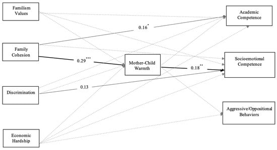 Mothers’ Cultural Assets and Challenges and Children’s Educational Adjustment via Mother–Child Warmth. Note. Standardized parameters are reported. Covariances, residual correlations, and covariates are not shown in the figure for parsimony. Solid lines represent significant direct effects. Bolded lines represent significant indirect paths. Dashed lines represent nonsignificant paths. * p < 0.05, ** p < 0.01, *** p < 0.001.