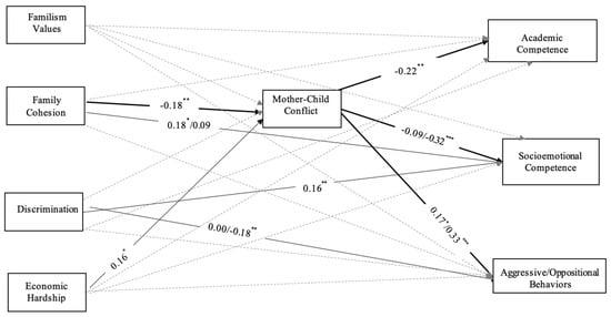For the model including mother–child warmth, comparisons of the fully unconstrained and constrained models by child gender and birth order revealed no changes in model fit, Δχ2 (19) = 9.82, p = 0.957 for child gender, and Δχ2 (19) = 26.98, p = 0.105 for sibling order, suggesting that the structural paths did not differ for girls versus boys and older versus younger siblings. As shown in Figure 1, family cohesion was positively related to academic competence (b = 0.30, p = 0.012), mothers’ experiences of discrimination were positively associated with child socioemotional competence (b = 0.09, p = 0.014), and familism and perceived economic hardship were not significantly associated with children’s adjustment. There was one significant indirect effect in this model: family cohesion was associated with socioemotional competence via mother–child warmth (ab = 0.052, 95% CI = [0.021, 0.096]). Significant covariates included child gender predicting academic competence (b = 0.30, p = 0.008), socioemotional competence (b = 0.24, p < 0.001), and aggressive/oppositional behaviors (b = −0.43, p < 0.001), such that girls reported higher academic and socioemotional competencies than boys, and boys reported higher aggressive/oppositional behaviors than girls. Mother nativity predicted academic competence (b = 0.48, p = 0.002), socioemotional competence (b = 0.17, p = 0.012), and aggression (b = −0.20, p = 0.029), such that teachers reported higher academic and socioemotional competencies and lower aggressive/oppositional behaviors for children of mothers born outside the U.S. Child age was not a significant covariate of any of the three adjustment outcomes.