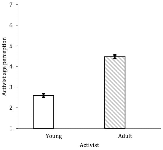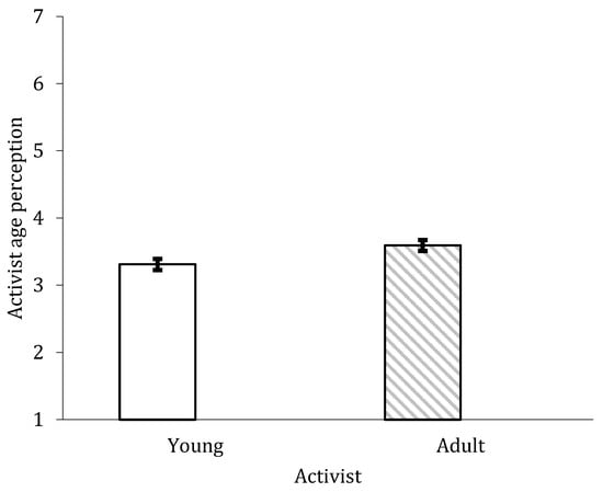 Regarding the manipulation check of age, the young activist was considered as younger (M = 2.60; SD = 1.24) when compared to the adult (M = 4.47; SD = 0.66), (F (1, 274) = 243.67, p < 0.001, ηp2 = 0.47) (Figure 1). Additionally, a chi-square test was used to check whether the participants remembered the activist. The results indicated that the participants were able to correctly identify the activist they saw as Jane Fonda or Greta Thunberg, χ2 (1, N = 280) = 264.22, p < 0.001).