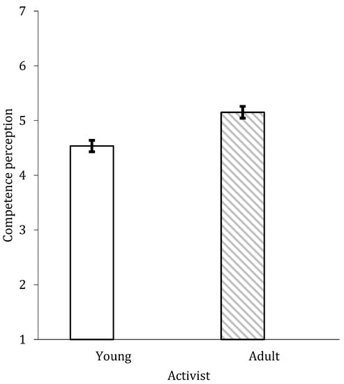 Regarding the stereotypical dimensions, starting with the competence dimension, there was a significant effect of age in this dimension (F (1, 274) = 16.72, p < 0.001, ηp2 = 0.06). The adult activist was perceived as more competent (M = 5.15; SD = 1.05) when compared to the young activist (M = 4.53; SD = 1.42) (Figure 2). Therefore, hypothesis 1 was not supported.
