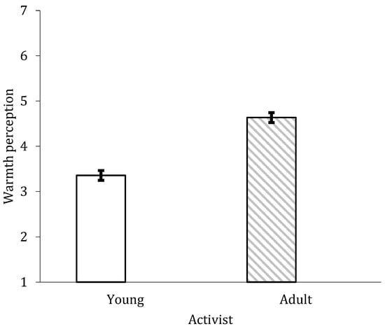 Regarding the dimension of warmth, there was also a significant effect (F (1, 274) = 67.36, p < 0.001, ηp2 = 0.20), where it appears that the adult activist was also perceived as more sociable (M = 4.63; SD = 1.23) when compared to the young activist (M = 3.36; SD = 1.35) (Figure 3). Hypothesis 2 was also not supported.