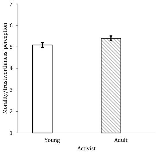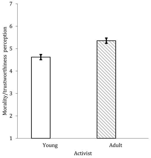 A significant effect of age was found regarding the stereotypical dimension of morality/trustworthiness (F (1, 226) = 4.19, p = 0.042, ηp2 = 0.02), where the adult activist was seen as more moral/trustworthy (M = 5.40; SD = 1.06) when compared to the young activist (M = 5.09; SD = 1.21) (Figure 8). Hypothesis 3 was also supported.