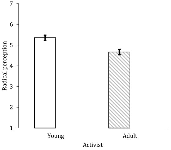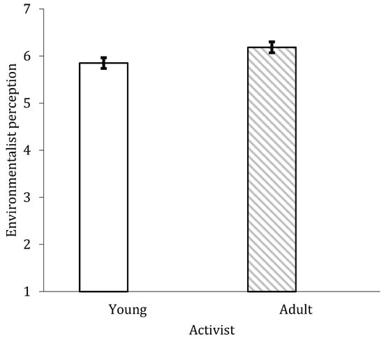 Regarding the two additional traits, the young activist was perceived as more radical (F (1, 274) = 14.06, p < 0.001, ηp2 = 0.05), (M = 5.35; SD = 1.57) when compared to the adult activist (M = 4.67; SD = 1.47) (Figure 5). The attribution of environmentalist, however, was found to be slightly more characteristic for the adult activist (M = 6.19; SD = 1.10) when compared to the young activist (M = 5.85, SD = 1.55), (F (1, 274) = 4.22, p < 0.04, ηp2 = 0.02) (Figure 6).