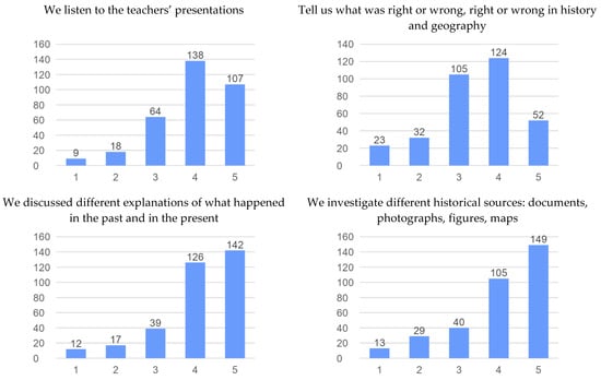 In coherence with the above, a critical issue in the field of social science didactics is the contrast between teachers’ perceptions, such as those shown in this paper, and their practices (). Works carried out for Colombia in geography (; ) and in the field of history (; ), in history, have evidenced the prevalence of basic and insignificant learning activities that do not increase higher and complex cognitive, procedural, or attitudinal developments in students. From the perspective of () and (), part of the research in social sciences didactics has shown that students limit themselves to repeating content without reaching a minimum level of understanding. As the content is presented in the classroom, students’ tasks are reduced to basic mental operations (), knowing how to locate and extract literal information from an academic text, a written source, a map, a graph, an axis, or an image. They only involve skills of reading, describing, locating, repeating, reproducing, or memorizing textual or iconic information at a basic level. Fewer activities are promoted that go beyond recalling phenomena or events and passing information back and forth with little or no comprehension.